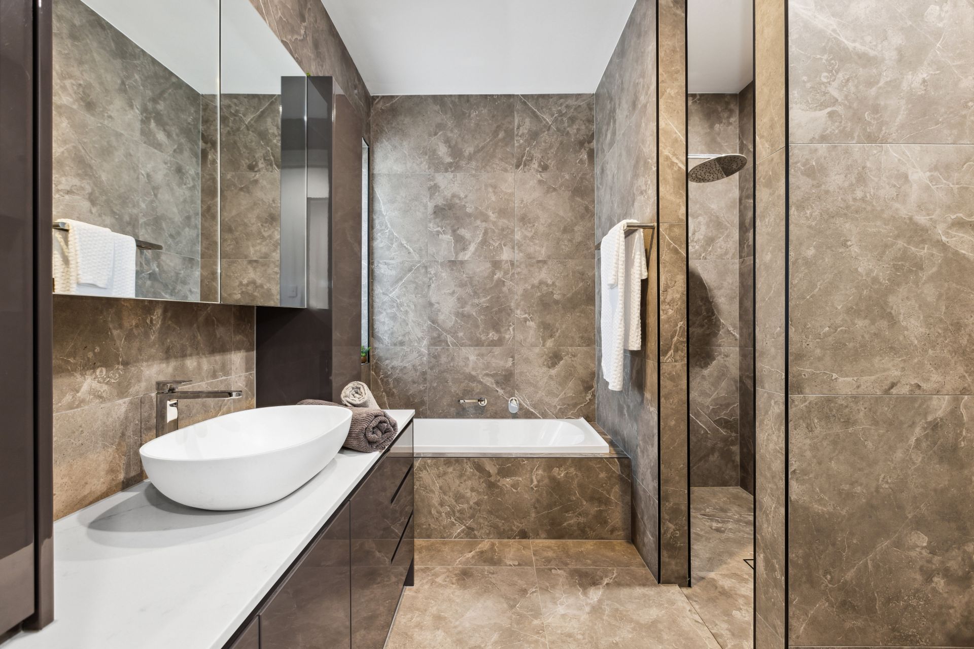 -Stunning main bathroom with shower alcove, bath, vanity with shelving and