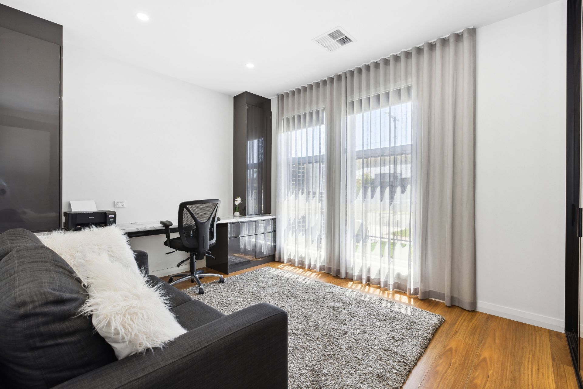 -Large master suite with striking floor to ceiling curtains, walk in robe flowing
