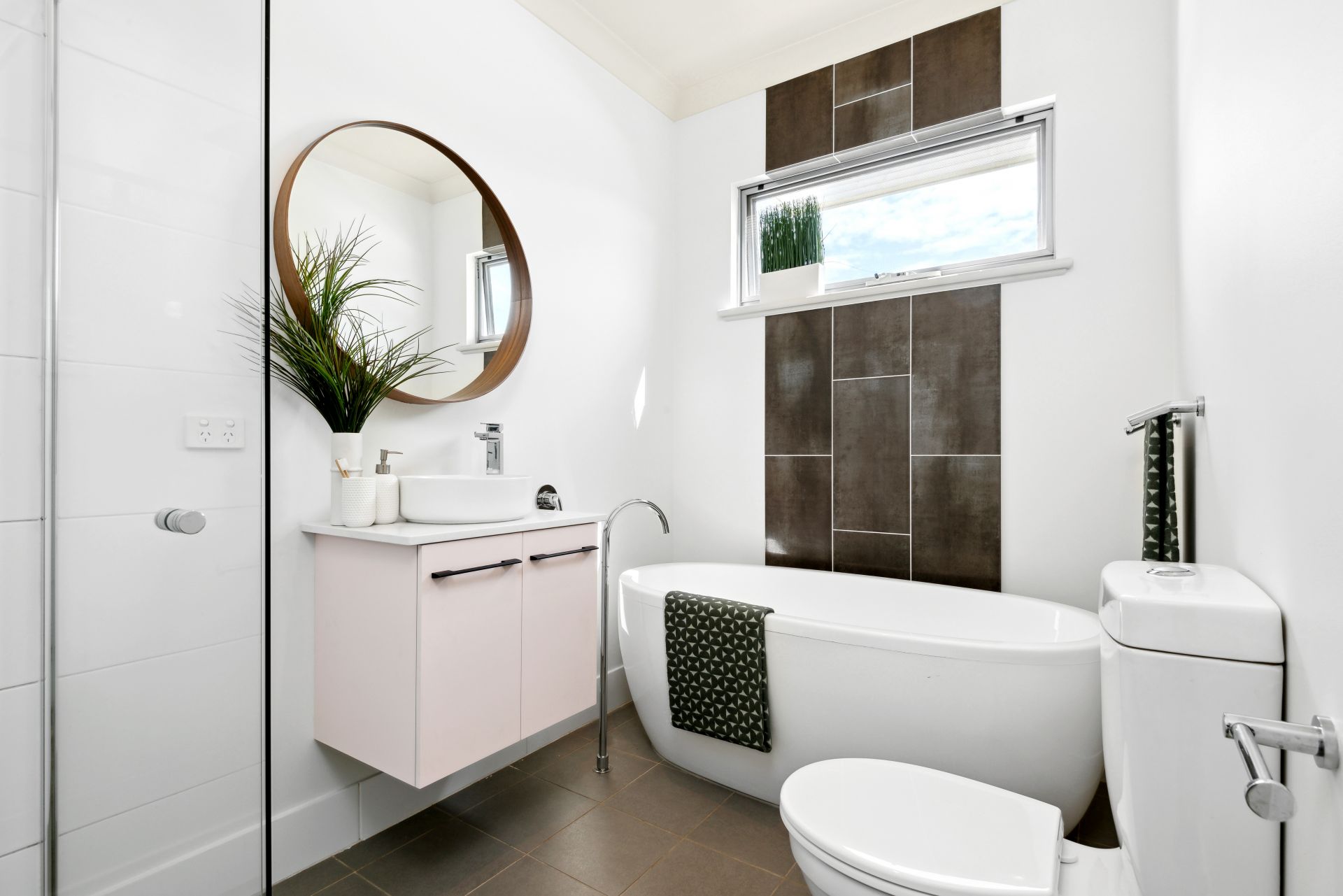•Gleaming main bathroom with free-standing bath, shower, and toilet.