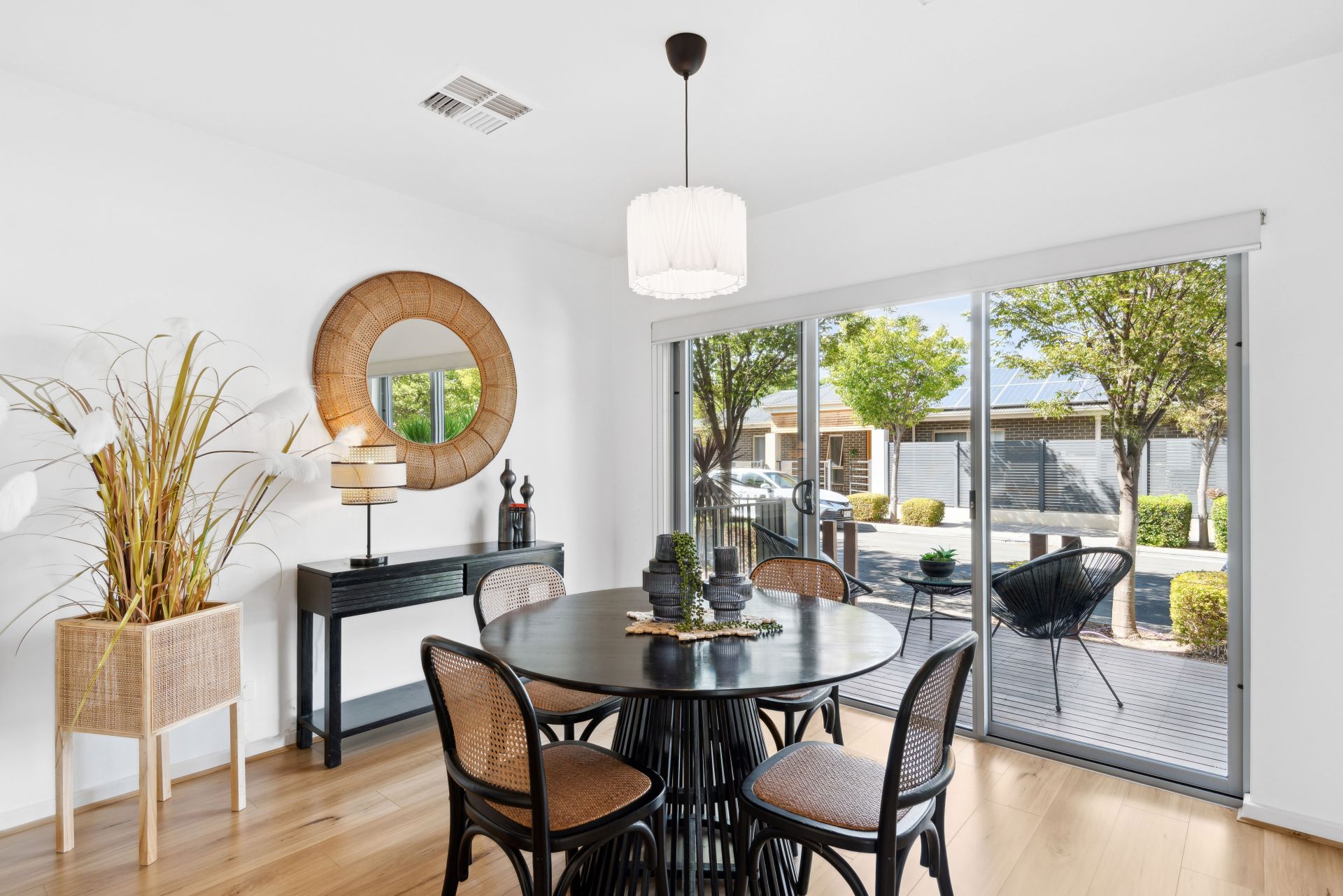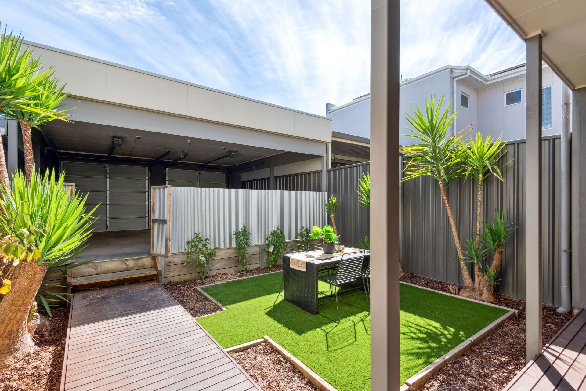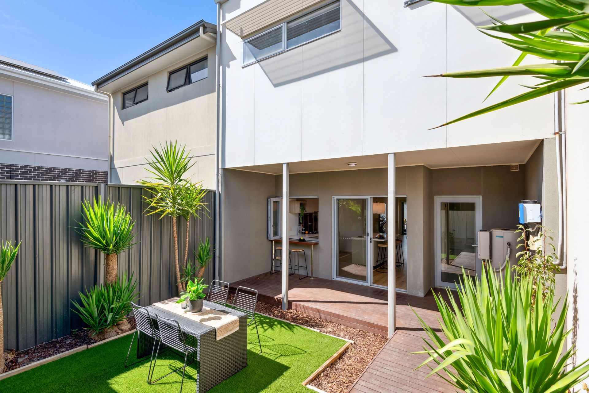 •Rear outdoor deck, great for entertaining guests and overlooks an easy-care green garden and astroturf lawn.
