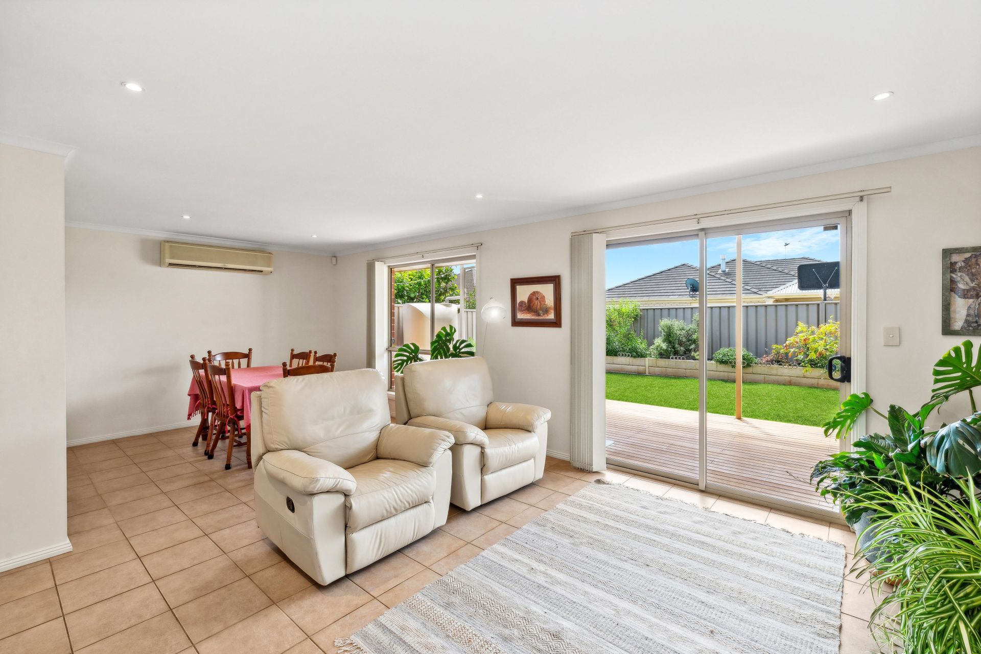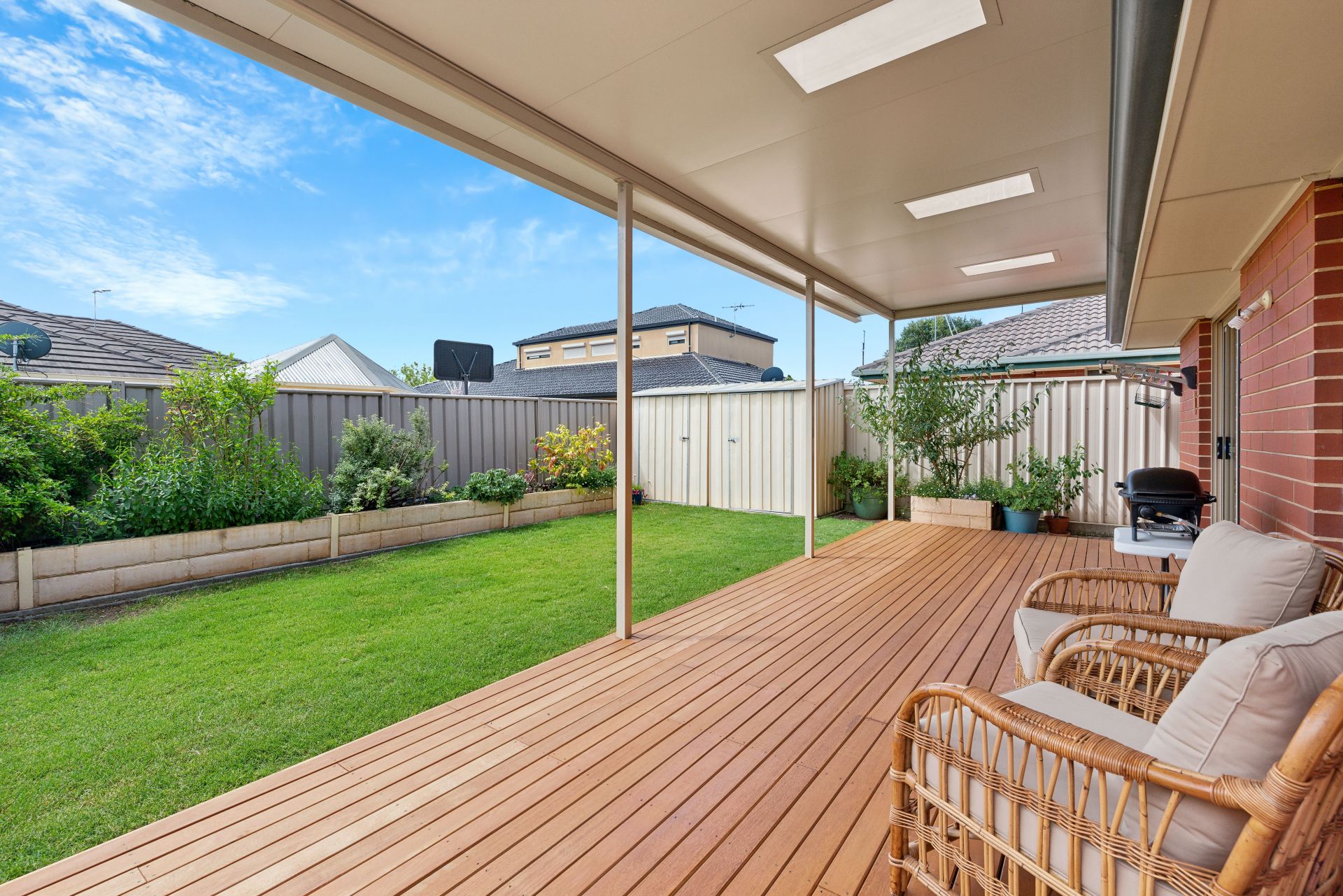 The living space open to the hardwood Kapur deck and large verandah with built-in skylights - the ideal place to spend afternoons with family and friends, while there is room for the kids to play on the lawn. Manicured gardens and two garden sheds complete the backyard space.