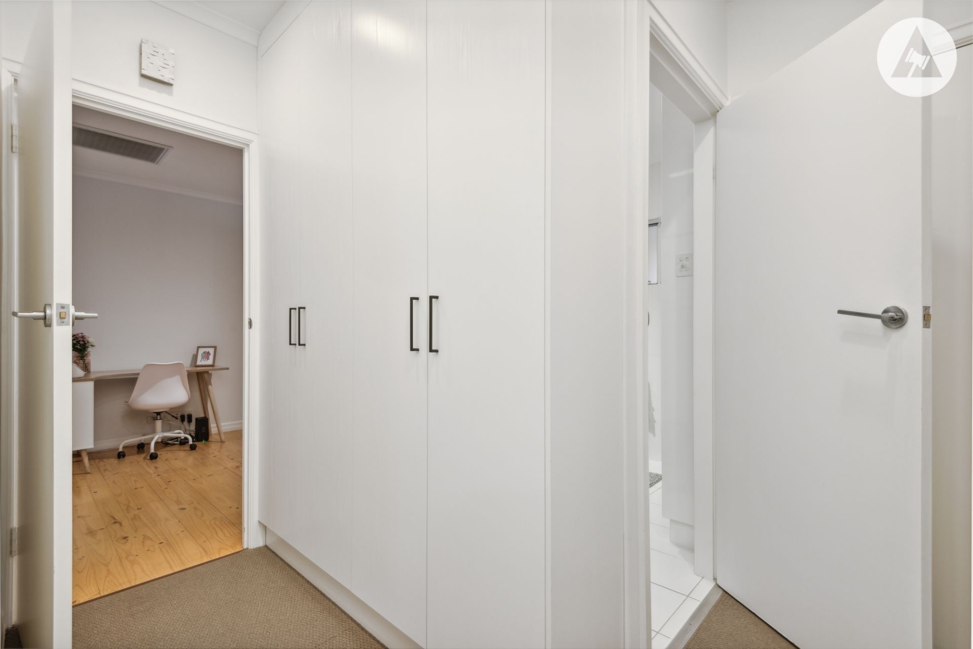 A standout feature is the abundance of built-in storage. Full-height cupboards line the hallway and bathroom, and there's additional storage in the side courtyard - a rare find!