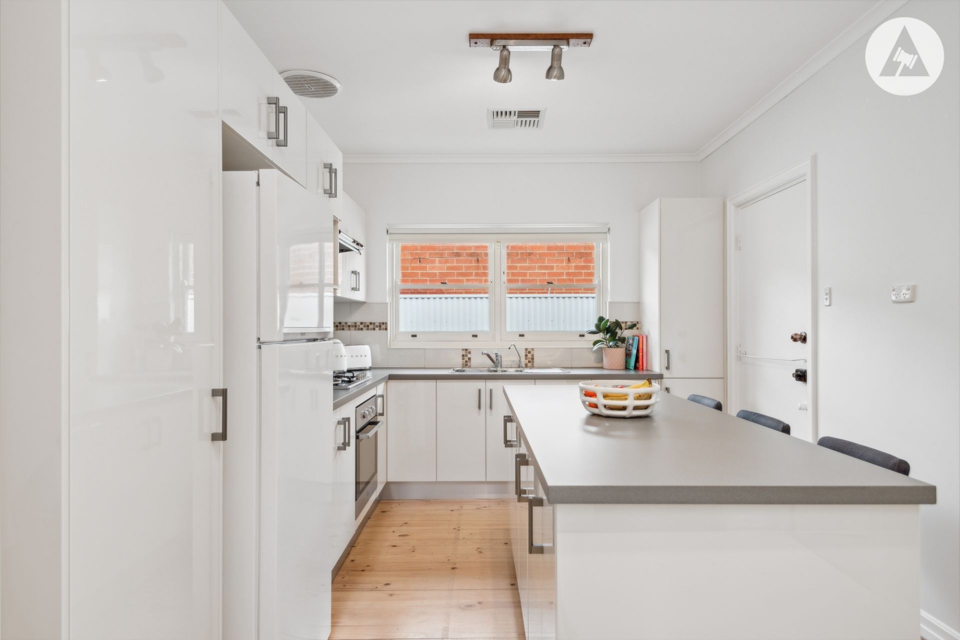 Inside presents with a light filled lounge and polished timber flooring throughout with generous 2.7m ceilings. The quality open plan kitchen features a stylish island bench with adjacent meals areas. A modern fit-out with solid 2pac joinery and stainless-steel appliances including gas cooking.