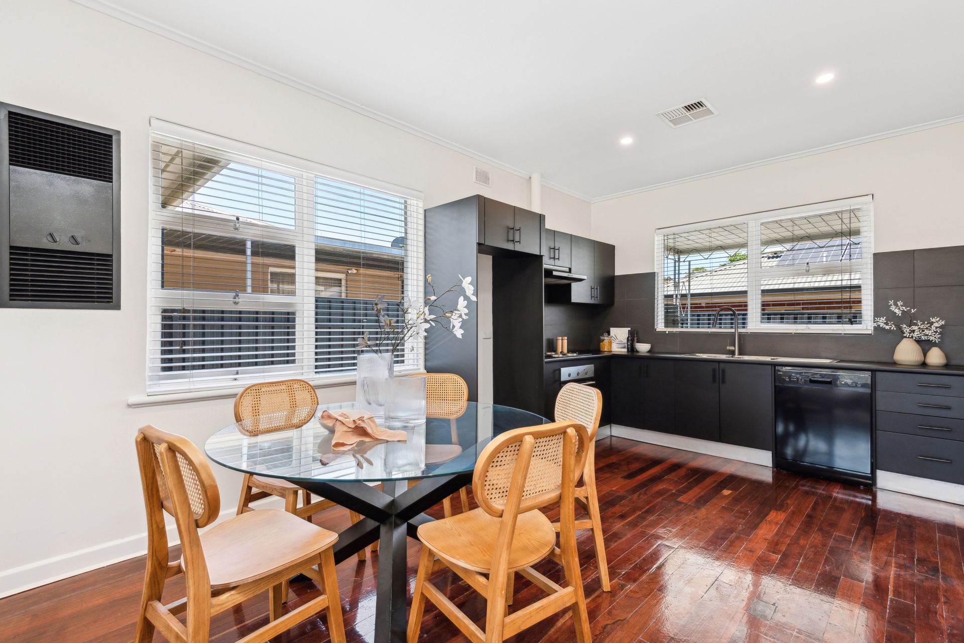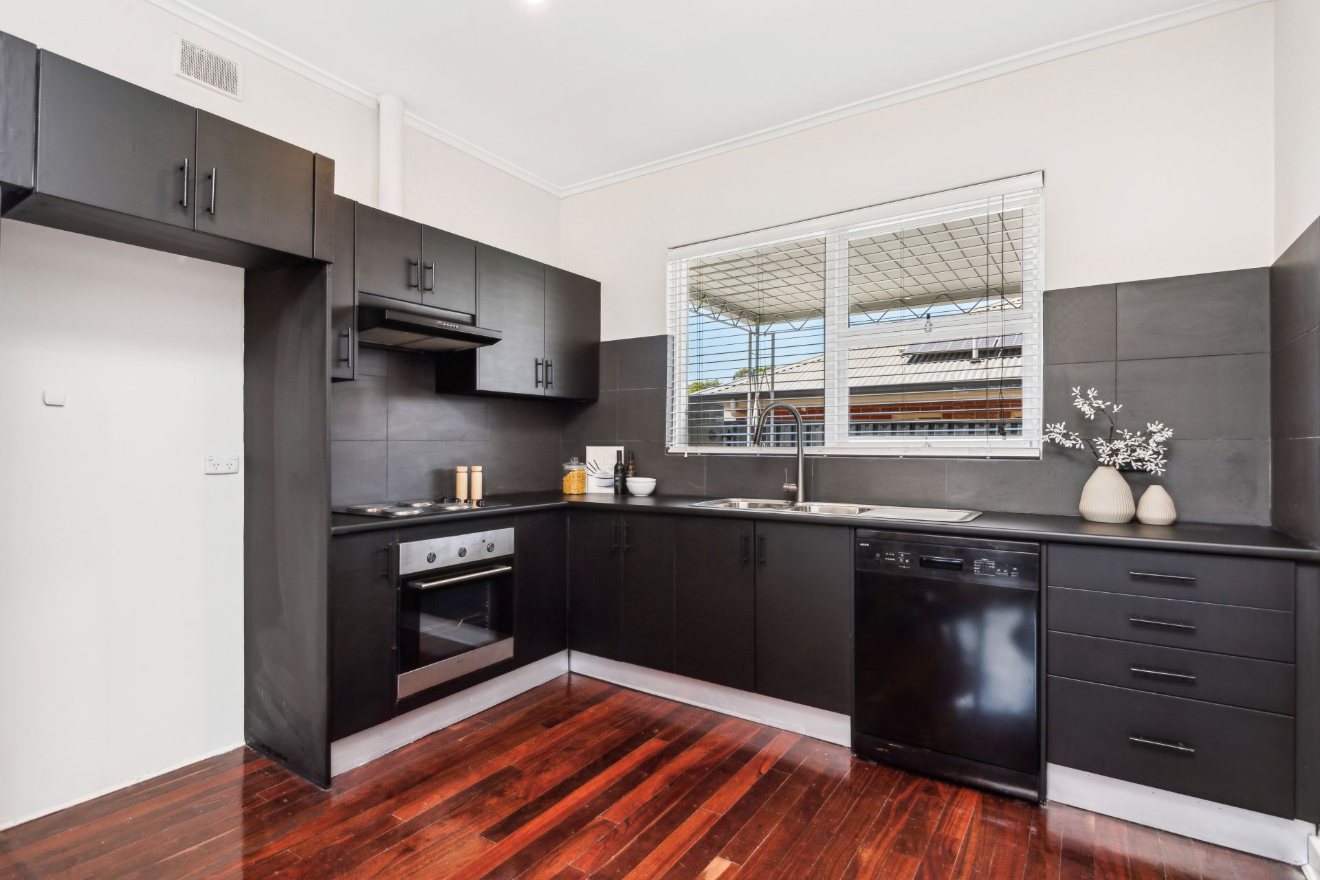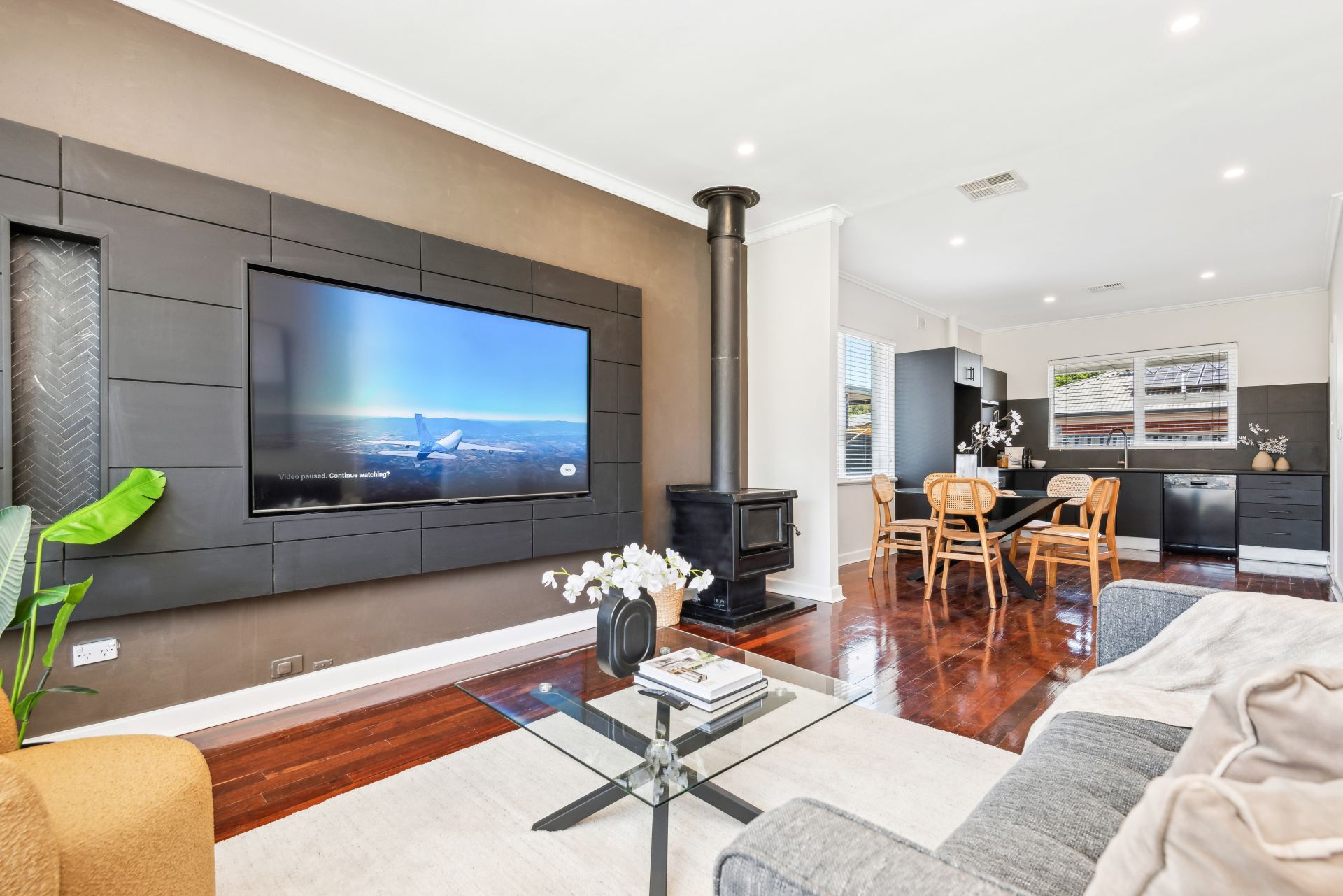 Inside, every detail has been thoughtfully upgraded, from the sleek black kitchen joinery to the spacious open-plan living area, featuring polished timber floorboards and a feature wall cladding that adds a touch of class.