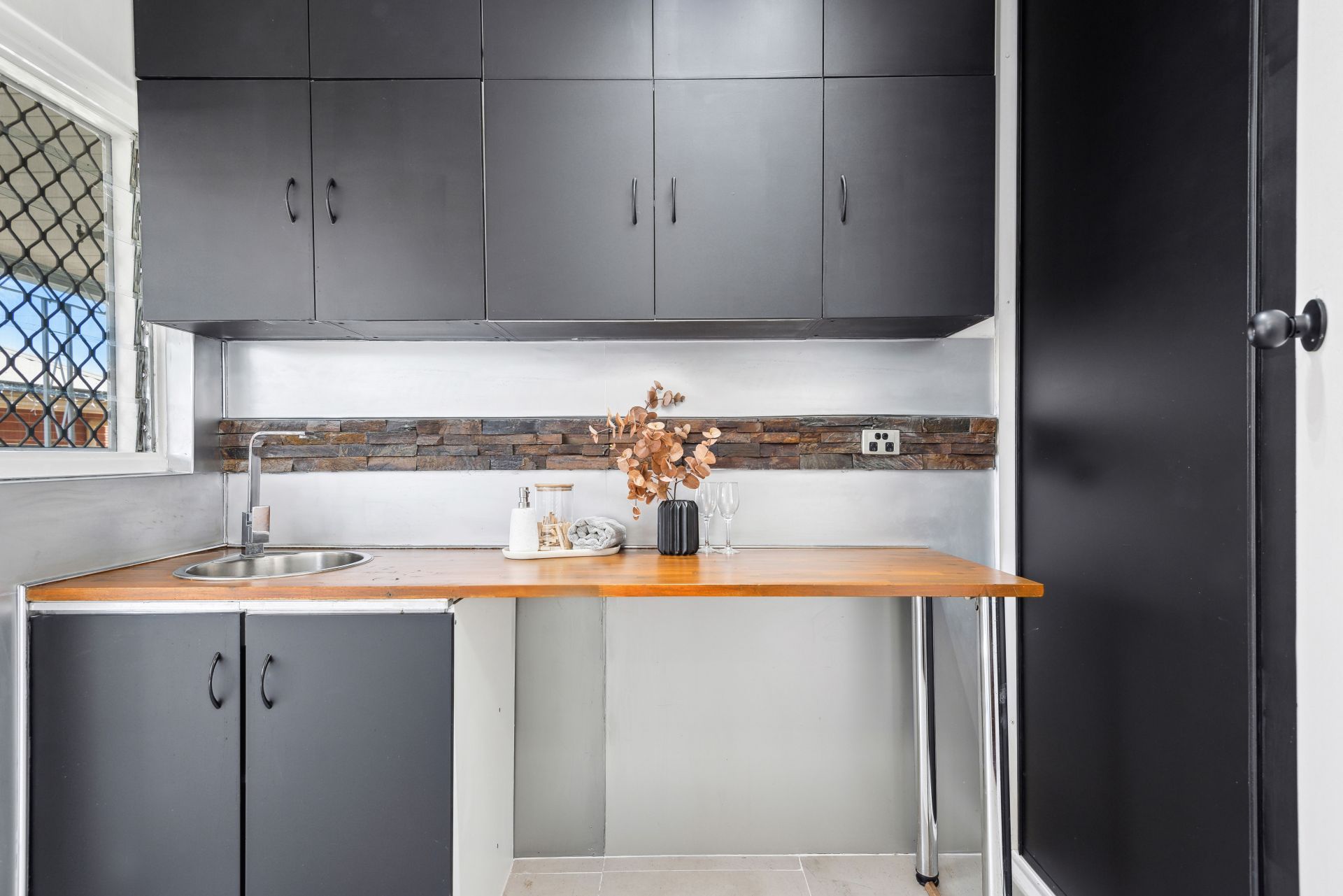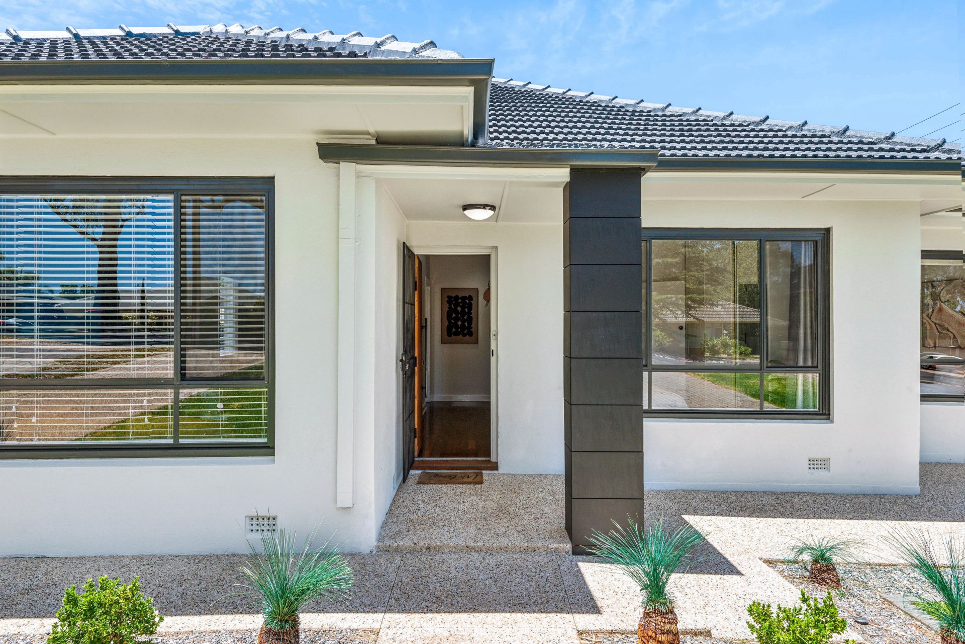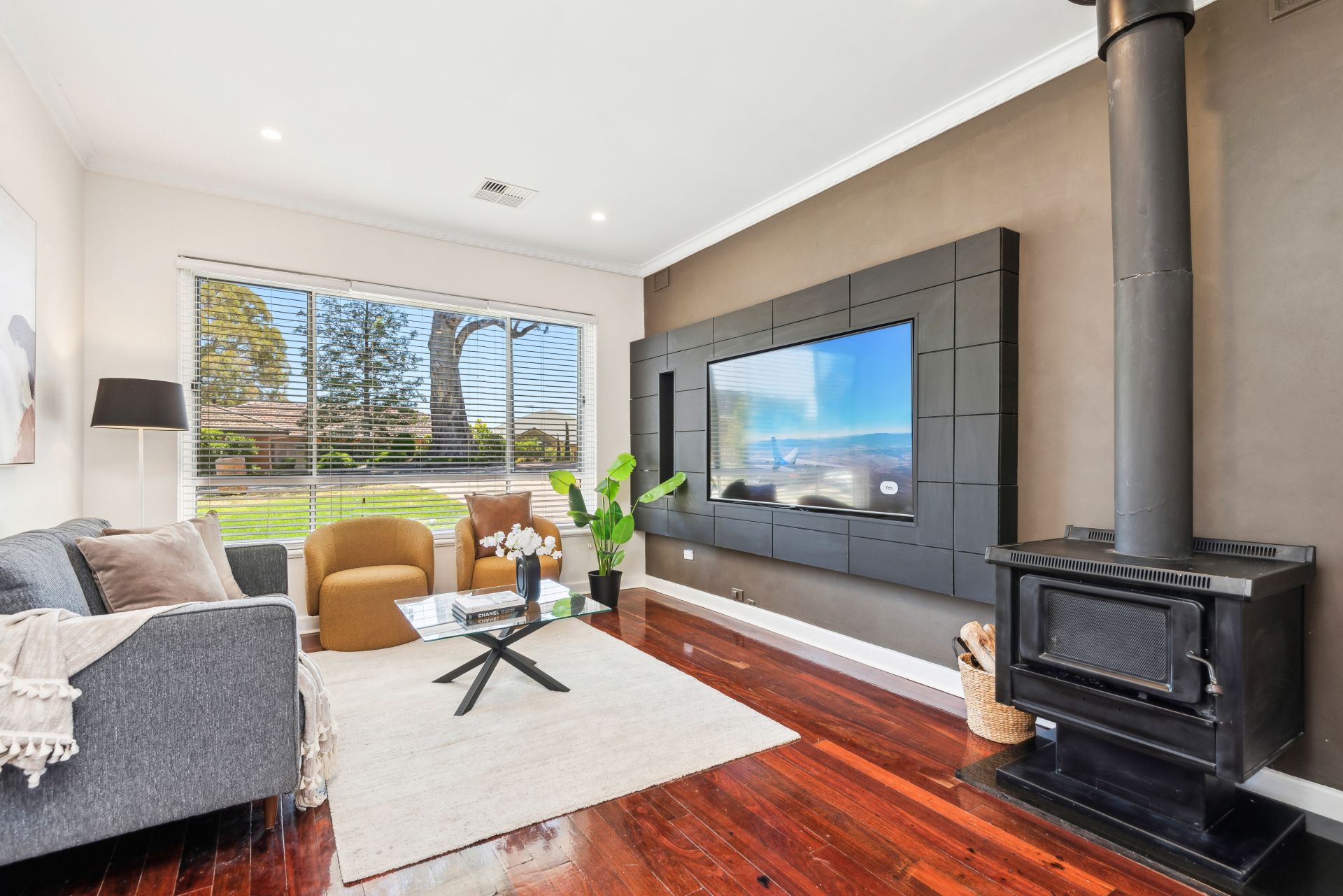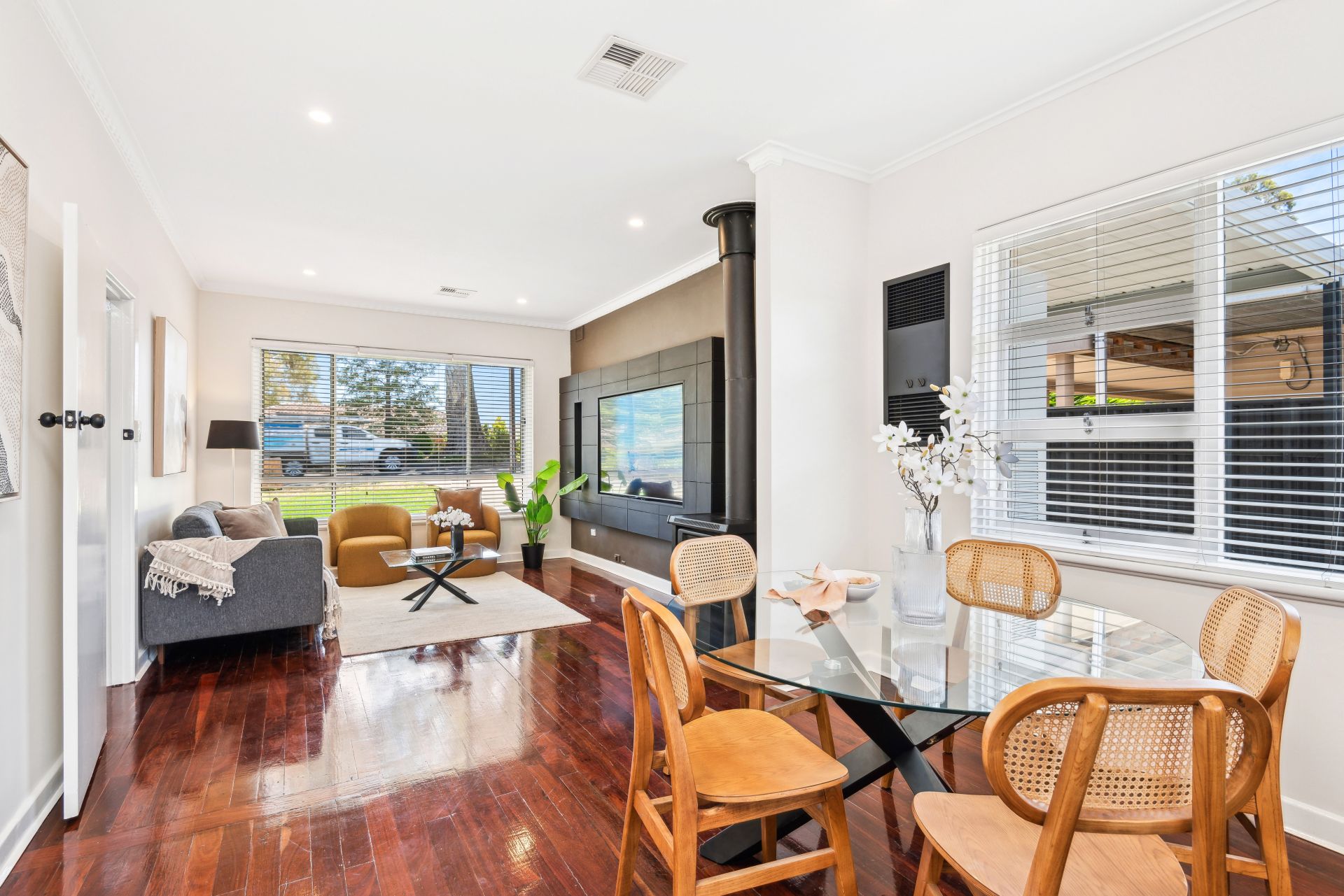 Inside, every detail has been thoughtfully upgraded, from the sleek black kitchen joinery to the spacious open-plan living area, featuring polished timber floorboards and a feature wall cladding that adds a touch of class.