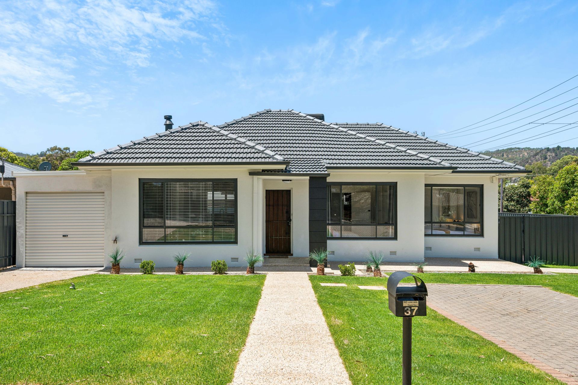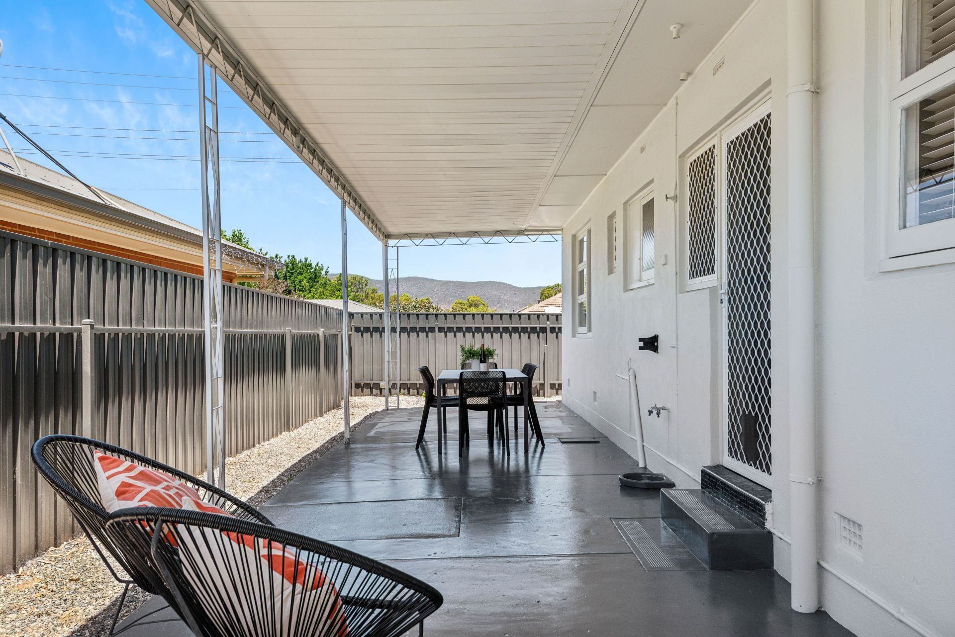 Outside, the manicured front garden, framed by contemporary exposed aggregate concrete, creates a welcoming first impression. The rear yard is a true gem, with a large undercover patio offering stunning views of the surrounding hills-perfect for unwinding in a serene outdoor setting.