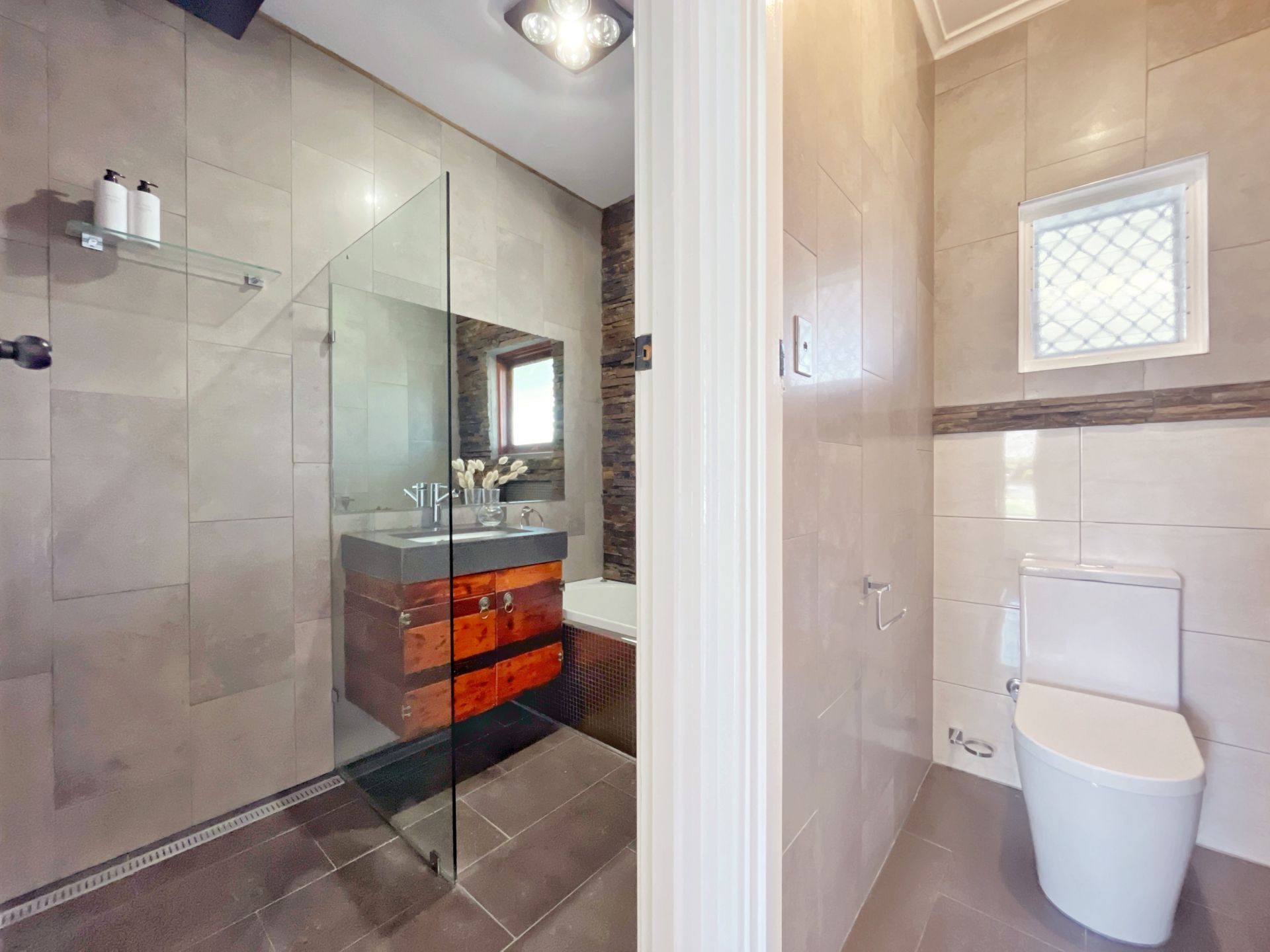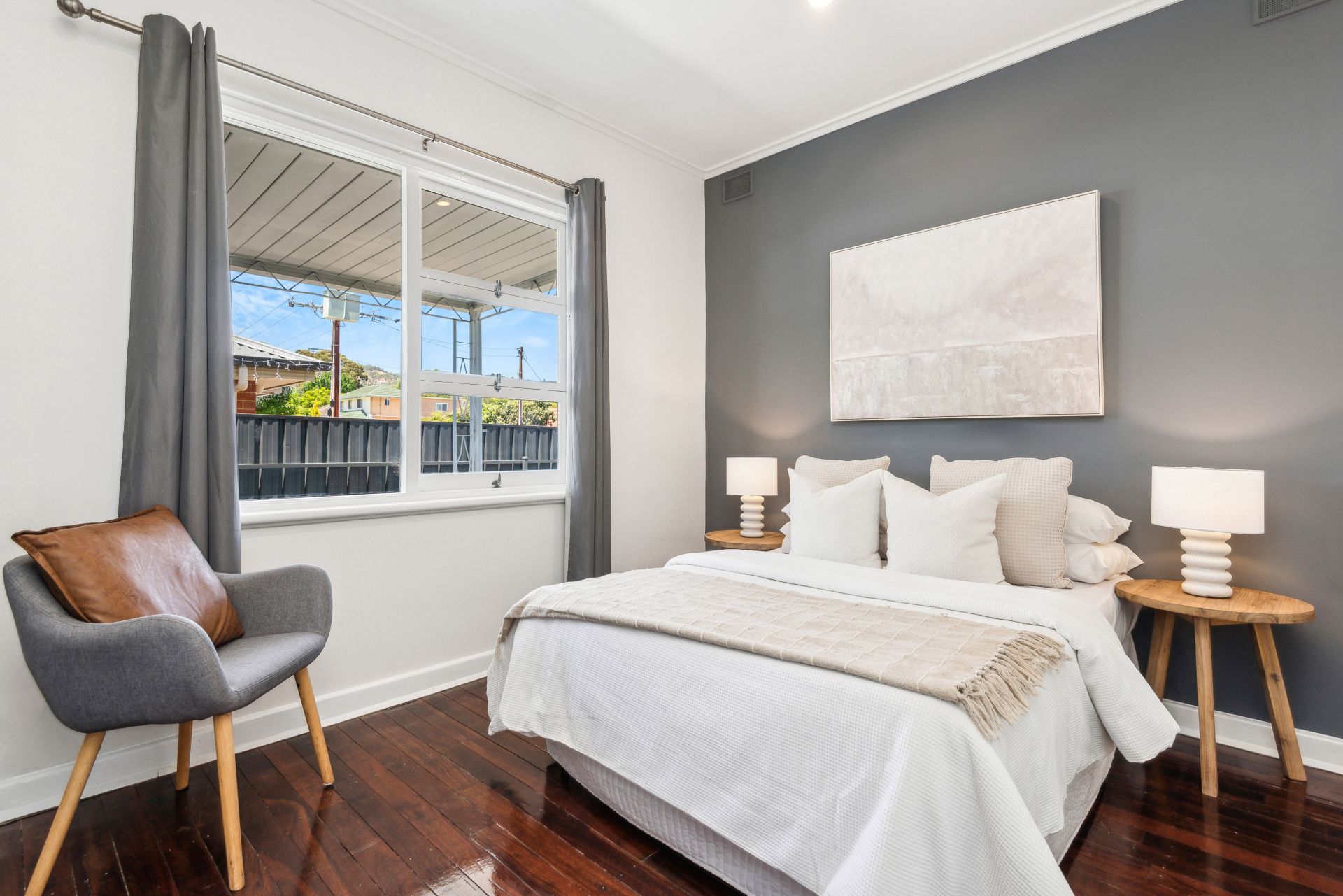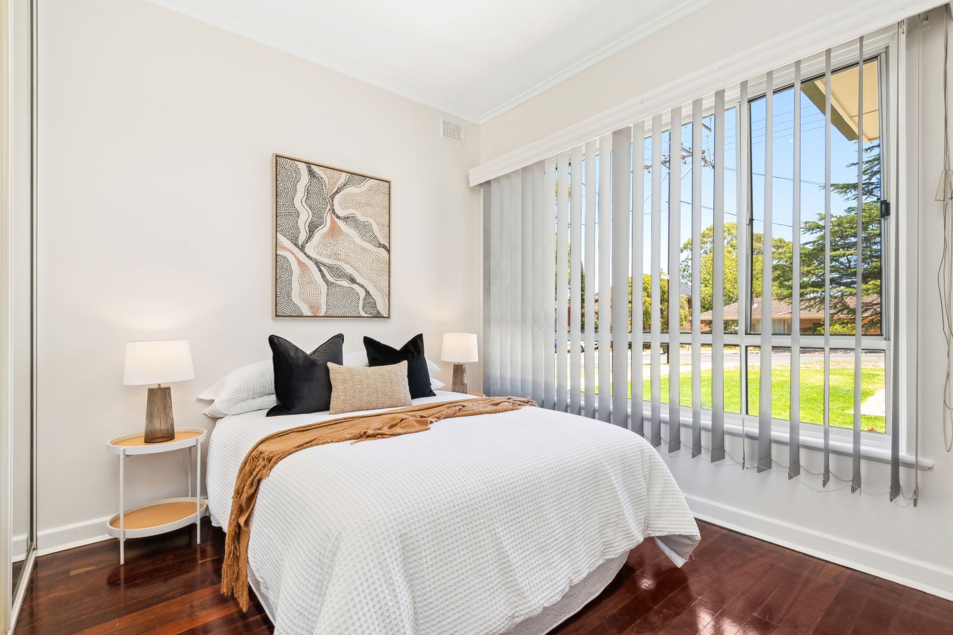 Three large bedrooms are fitted with full height built-in robes, offering ample storage space. A fully renovated bathroom offers stylish floating vanity, quality luxe fixtures, frameless shower, bath, and a moody colour scheme. Bedrooms features a combination of blinds and curtains, providing privacy. Perfect for couples, small families, or investors seeking a practical layout.