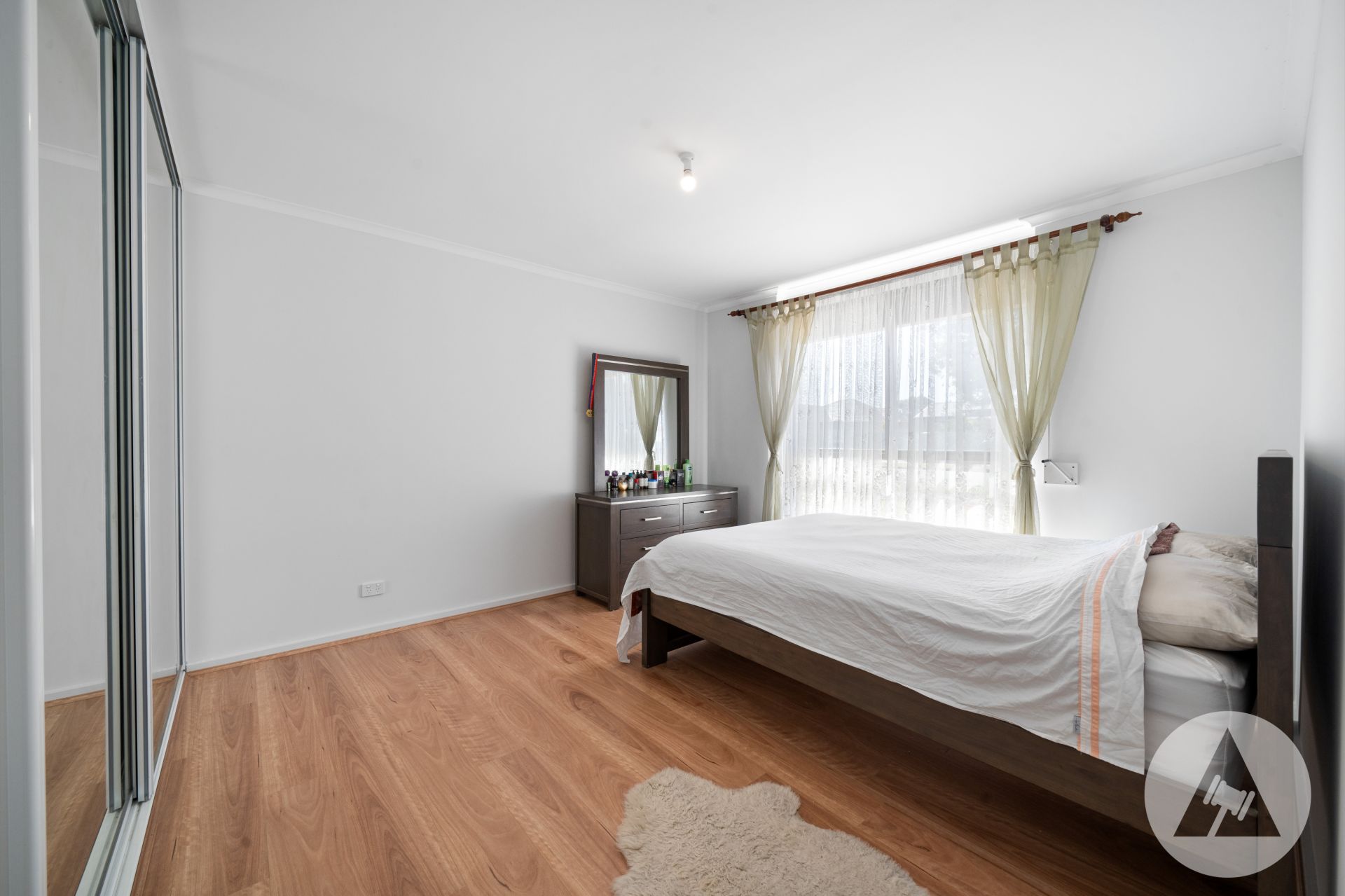 Two good-size bedrooms adjacent the light and bright bathroom. The large master bedroom includes mirrored built-in robes. There are easy care floating floorboards throughout and exterior window shutters for added security and privacy.